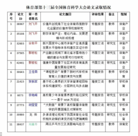 本次会议收到论文投稿达26698篇,体育部师生共有11篇论文被录用。教师刘飞平在体育产业分会“体育产业与数字化转型研究”和“体育场馆运营改革研究”专题会场分别作口头报告,王佳茵在学校体育分会专题会场“新时代体育教师队伍建设研究”作口头报告,刘藤升在体育史分会专题会场“体育对外交流史”专题作专题报告,李艳峰在学校体育分会专题会场“学校体育促进青少年体育素养提升的案例研究”作专题报告,龙帅在社会体育分会专题会场“体育社会组织发展的相关问题研究”作专题报告;贺新家、胡莹莹、佘秋平分别在学校体育和体育产业分会场进行了墙报交流;郭岩松论文录用为体育产业分会场书面交流。