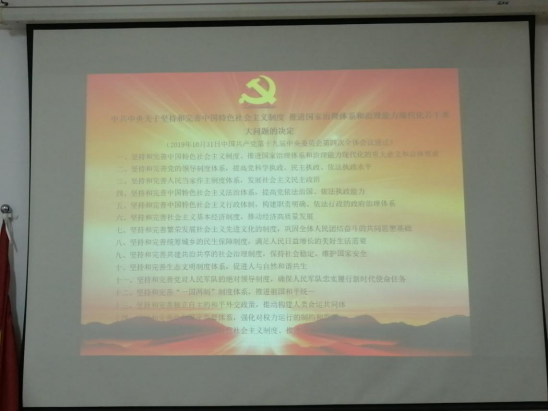 全体会员集中研习了《中共中央关于坚持和完善中国特色社会主义制度、推进国家治理体系和治理能力现代化若干重大问题的决定》、习近平总书记《关于<中共中央关于坚持和完善中国特色社会主义制度 推进国家治理体系和治理能力现代化若干重大问题的决定>的说明》。体育部直属党支部书记张春义结合自身学习,从坚持和完善中国特色社会主义制度、推进国家治理体系和治理能力现代化的重大意义和总体要求、坚持和完善党的领导制度体系、人民当家作主制度体系、法治体系、 行政体制、基本经济制度、先进文化的制度、民生保障制度、社会治理制度、生态文明制度体系、党对人民军队的绝对领导制度、“一国两制”制度体系、独立自主的和平外交政策、国家监督体系、加强党对坚持和完善中国特色社会主义制度、推进国家治理体系和治理能力现代化的领导等十五个方面进行了解读。