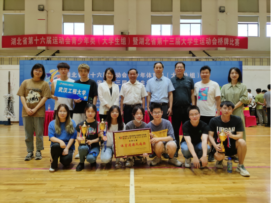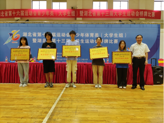 李志旭、江本武、范东芳、张庆、乐建军分别为获奖学校和个人颁发奖杯、奖牌和证书并合影留念。最后,李志旭宣布湖北省第十六届运动会青少年体育类(大学生组)暨湖北省第十三届大学生运动会桥牌比赛闭幕。(审稿江本武)