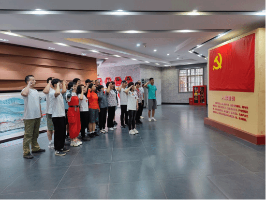 体育部直属党支部全体党员在新四军第五师历史陈列馆前列队,书记万莉莉在庄严肃穆的氛围下带领全体党员重温入党誓词。