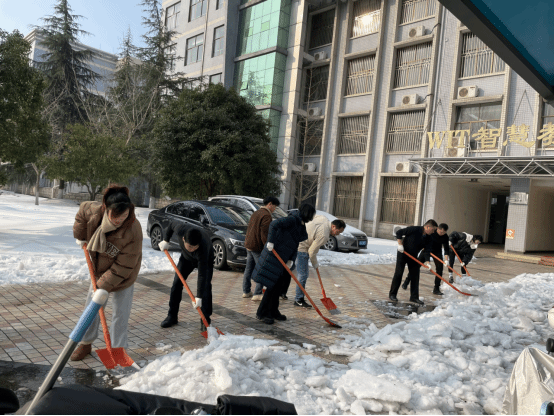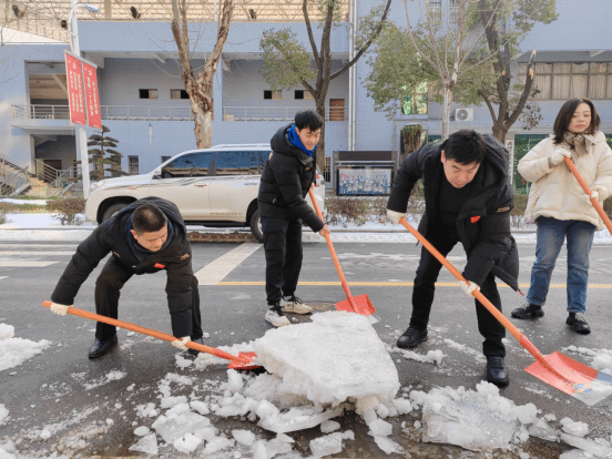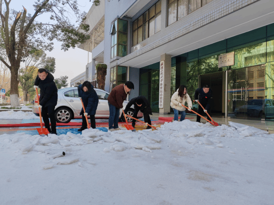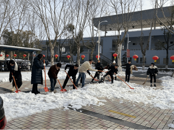 在体育部班子的带领下,教职工们不畏严寒,齐心协力,手持铁锹、除雪铲等工具,全力清除道路上的积雪和暗冰。